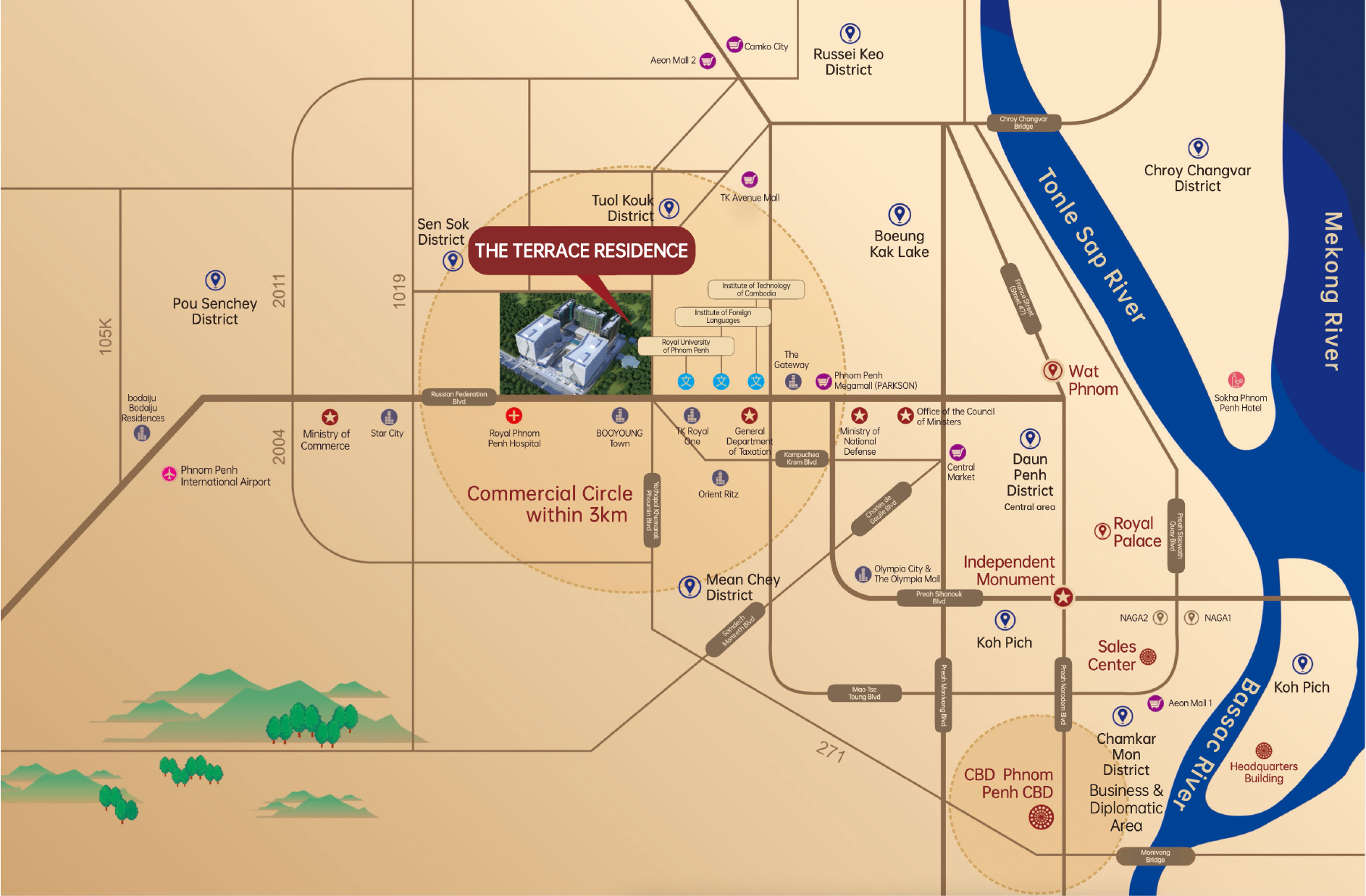 The project is located in the core area of the international airport, at the intersection of the Sensok, Tuol Kork, and Chamkarmon districts, and adjacent to the major artery of Phnom Penh, Russian Boulevard.